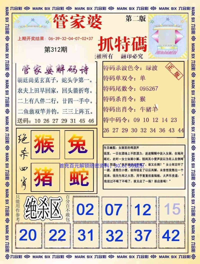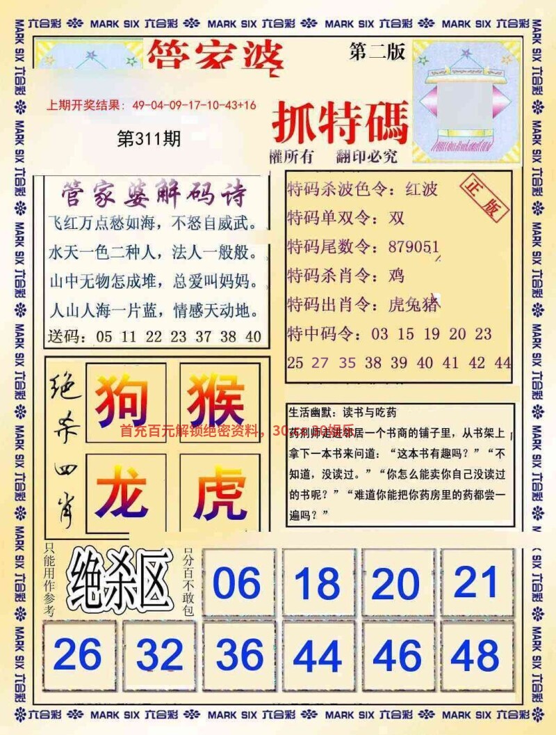 | 311期:家野两肖【野兽+羊鸡】开:蛇37准 |